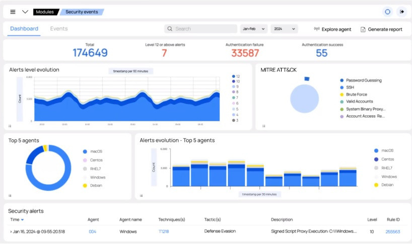 La solution se compose de plusieurs agents de sécurité des terminaux, déployés sur les systèmes surveillés, et d’un serveur de gestion, qui collecte et analyse les données recueillies par les agents. En outre, elle a été entièrement intégré à Elastic Stack, fournissant un moteur de recherche et un outil de visualisation des données qui permet aux utilisateurs de naviguer à travers leurs alertes de sécurité.